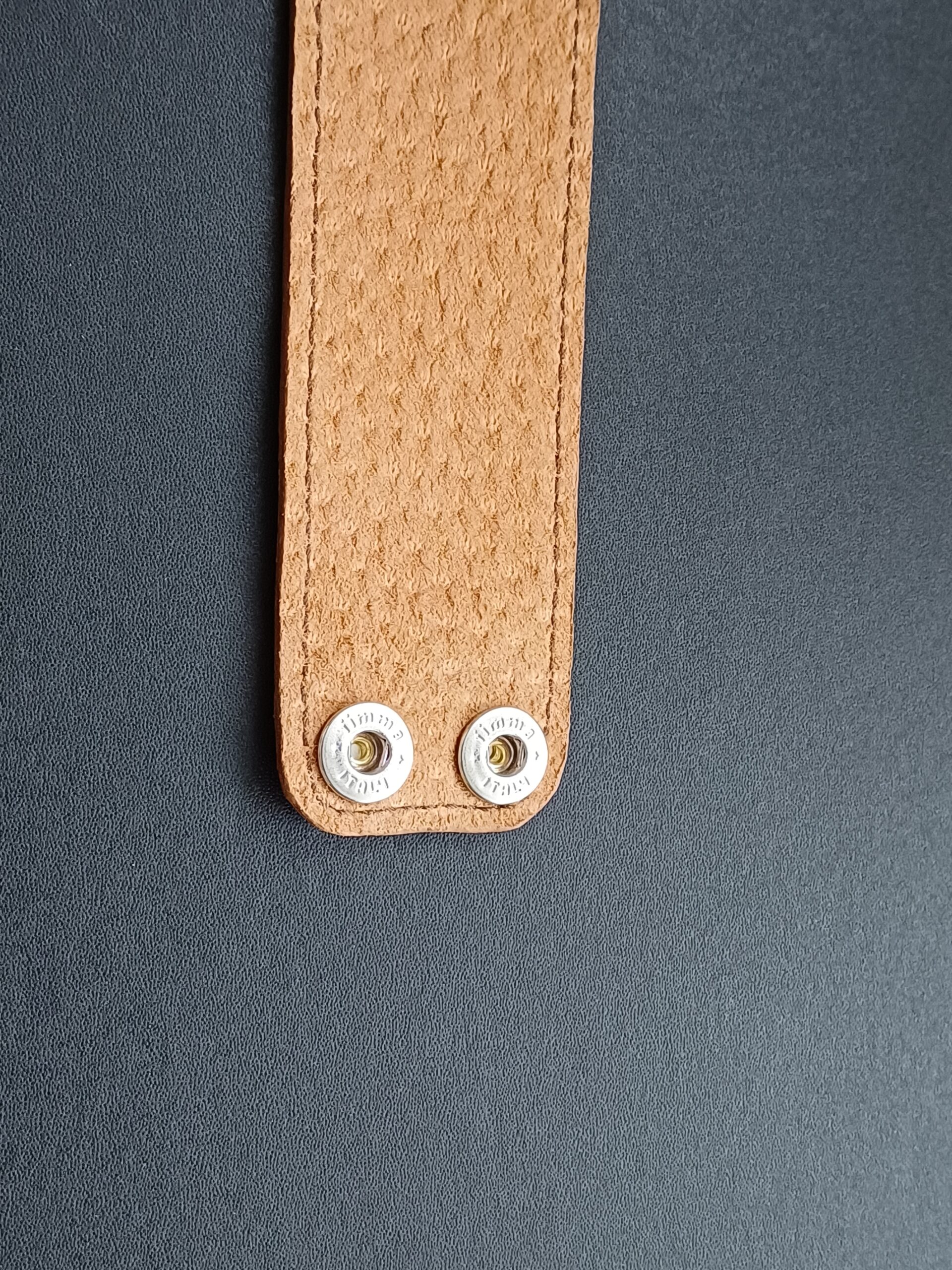 Deze armband bestaat aan de buitenkant uit gerecycled bruin splitleder en aan de binnenkant zacht voering leer. De hoeken zijn afgerond. De sluiting bestaat uit 1 of meerdere drukknopen, afhankelijk van de breedte van je armband.