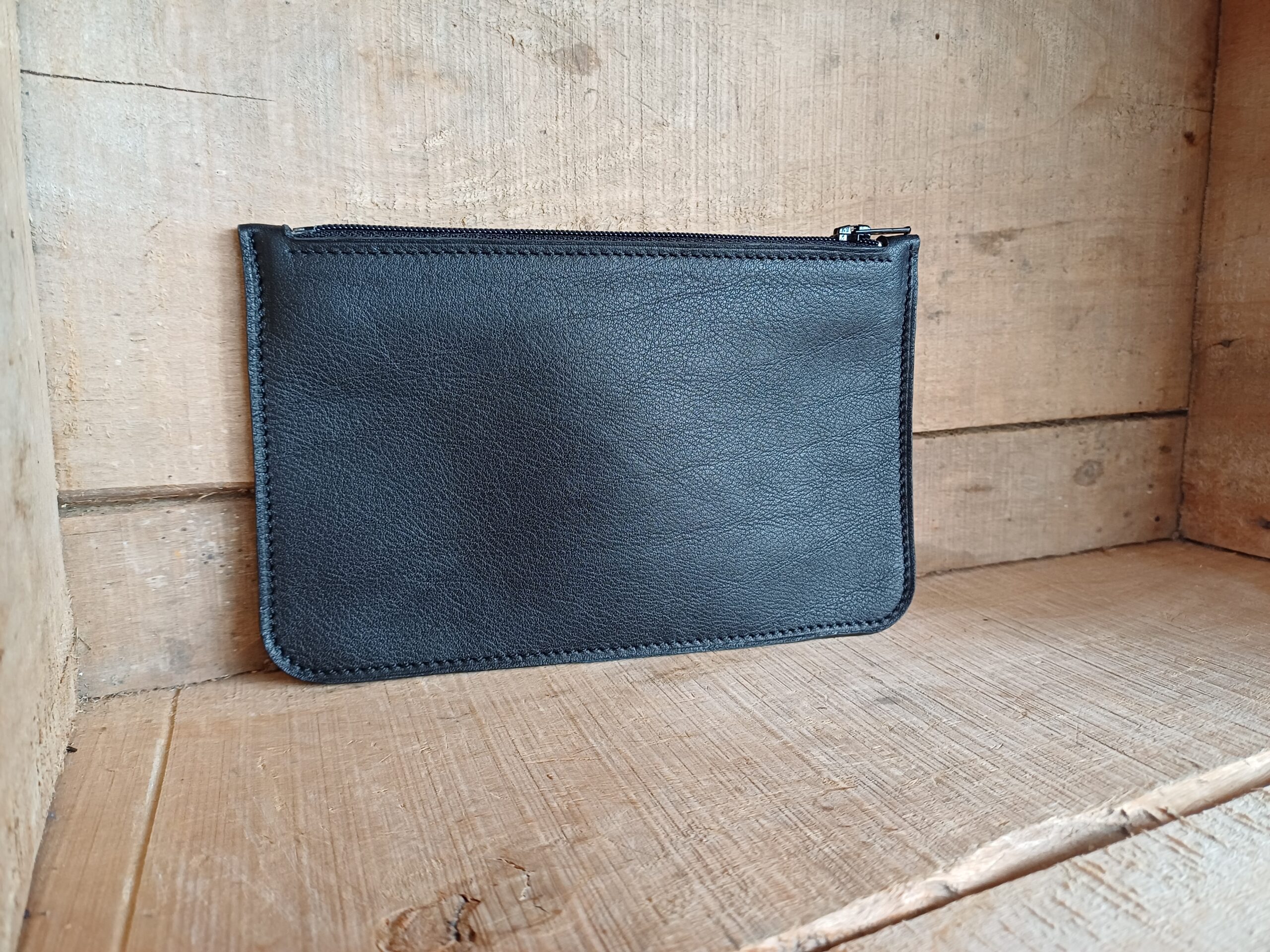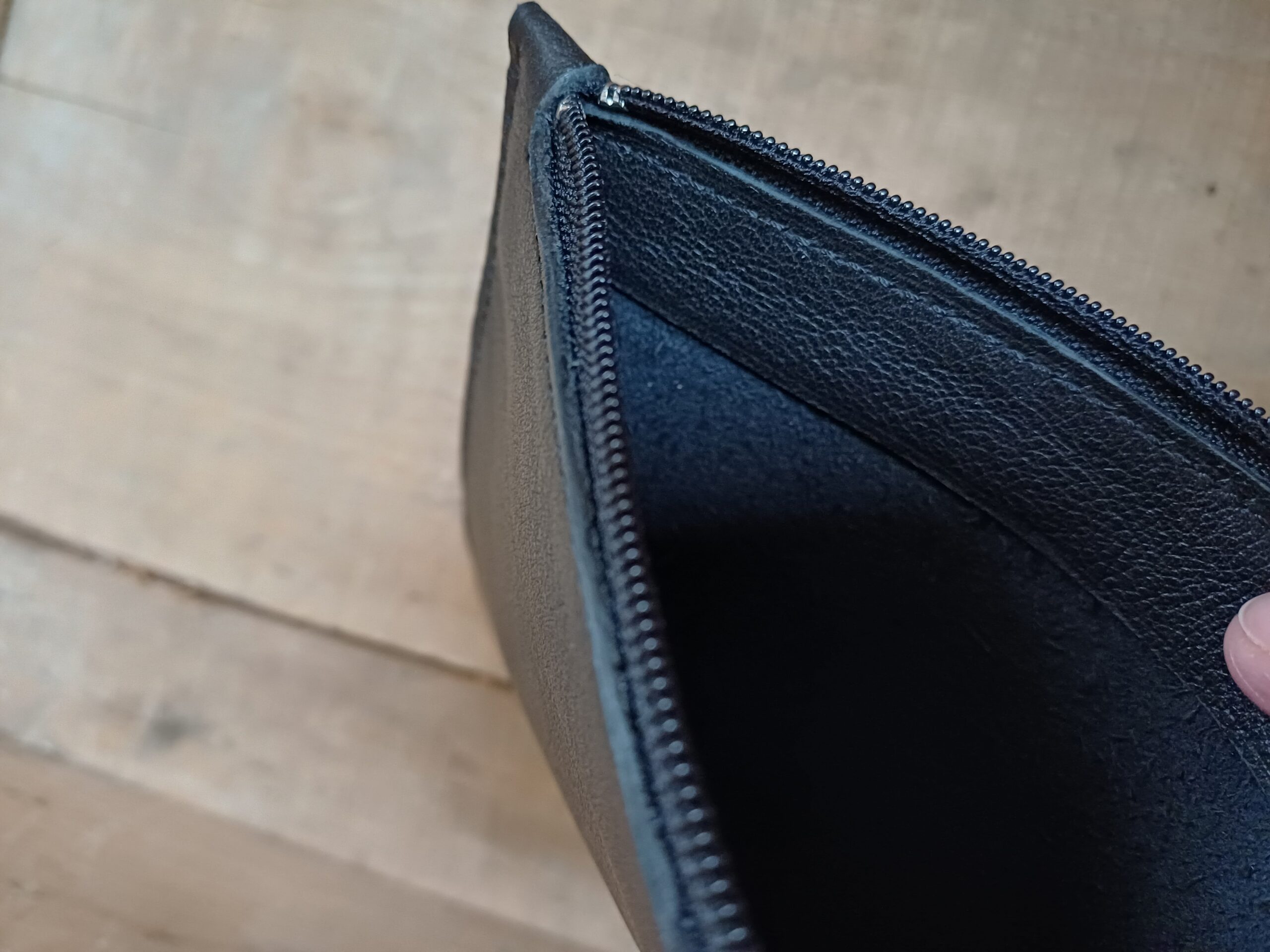 Het zakje bestaat uit 1 laagje leer. Het beleg aan de binnenkant van de rits is eveneens afgewerkt in leder. De buitenkanten zijn afgewerkt met verf en het zakje is stevig samen gestikt. De rits is volledig in het zwart (niet grijs zoals in het voorbeeld op de foto).